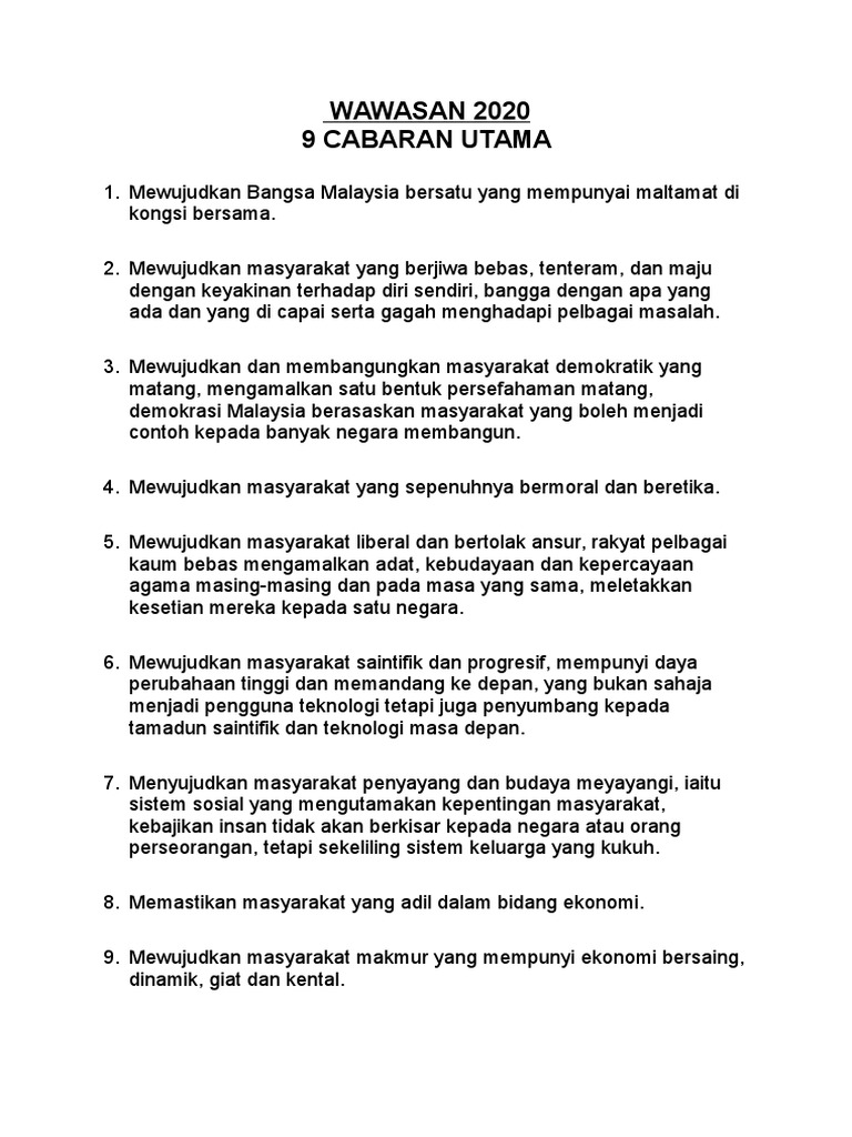 Cabaran ke 7 mewujudkan masyarakat penyayang dan budaya menyayangi iaitu satu sistem sosial yang mana kepentingan masyarakat adalah lebih utama daripada diri sendiri yang mana kebajikan insan tidak akan berkisar kepada orang perseorangan tetapi disekeliling sistem keluarga yang. Dalam wawasan 2020 9 cabaran. 9 cabaran wawasan 2020 soalan. Sebagai remaja kita perlulah bersama sama bekerjasama di bawah satu payung untuk menuju ke wawasan 2020 selain itu kita haruslah belajar bersungguh sungguh supaya suatu hari nanti kita akan menjadi rakyat yang bersedia menjadi penyumbang untuk negara kita pada masa hadapan tanpa mengira kaum warna kulit agama mahupun bahasa supaya pada tahun 2020 malaysia akan dikenali di seantero dunia.
