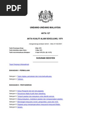 Akta alam sekitar 1974 pdf. 14 mac 1974 tarikh mula berkuatkuasa ditetapkan. Akta racun makhluk perosak 1974 akta 149 garis panduan kaedah kaedah racun makhluk perosak pengendali kawalan makhluk perosak 2004 lembaga racun makhluk perosak kuala lumpur 2004. Akta 127 akta kualiti alam sekeliling 1974 mengandungi pindaan terkini akta a1102 2001 tarikh persetujuan diraja. 2 kata kata pendahuluan.