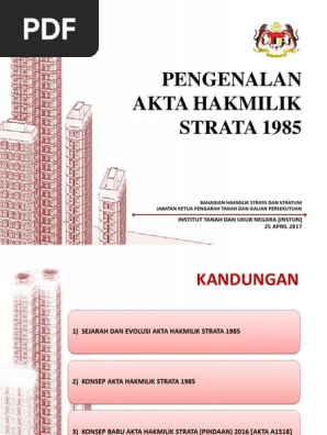 Strata titles act 1985. Akta hakmilik strata 1985 author. Akta hakmilik strata 1985 adalah akta untuk memudahkan pecah bahagi bangunan atau tanah kepada petak petak pelupusan hakmilik hakmilik dan kutipan cukai dan bagi maksud maksud yang berkaitan dengannya. Diperbuat oleh parlimen malaysia seperti yang berikut.
