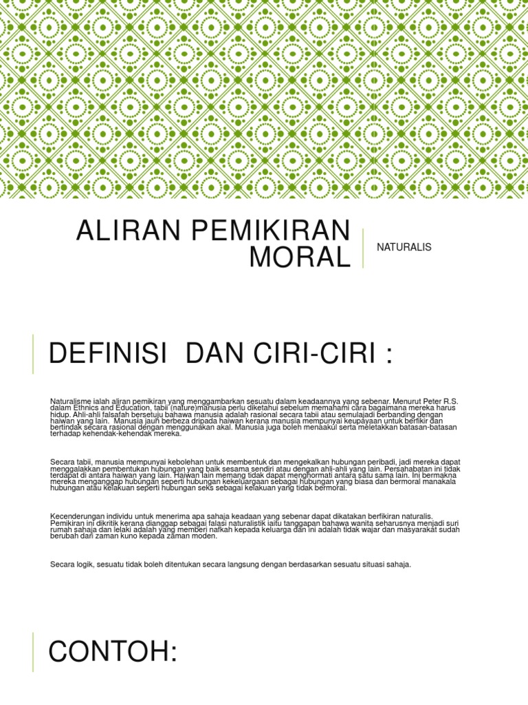 Aliran pemikiran moral pdf. 592 moral diartikan sebagai akhlak budi pekerti atau susila. Kita tentu sangat sadar bahwa proses pendidikan itu tidak. Bagi individu yang yang mengamalkan aliran naturalis cenderung menerima apa sahaja keadaan yang sebenarnya. Menurut ee 1996 seseorang yang berfikiran naturalis akan menerima sahaja takdir yang telah ditentukan ke atasnya.