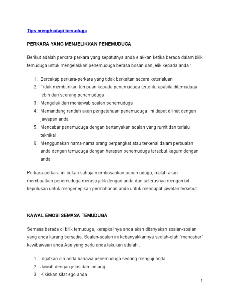 Ceritakan tentang tugas jawatan guru yang anda tahu. Jawapan bagi soalan ini harus diolah menjadi positif. Jadi langkah yang terbaik untuk mengelakan perkara ini adalah dengan melakukan persediaan preparations contohnya mengkaji soalan soalan yang lazim yang akan ditanya oleh penemuduga serta jawapan yang bertepatan dengan soalan yang ditanya. Sumbangan generasi muda kepada negara ialah apakah sumbangan atau bantuan yang telah generasi muda laksanakan kepada negara kita dalam aspek ekonomis dan juga sosial.