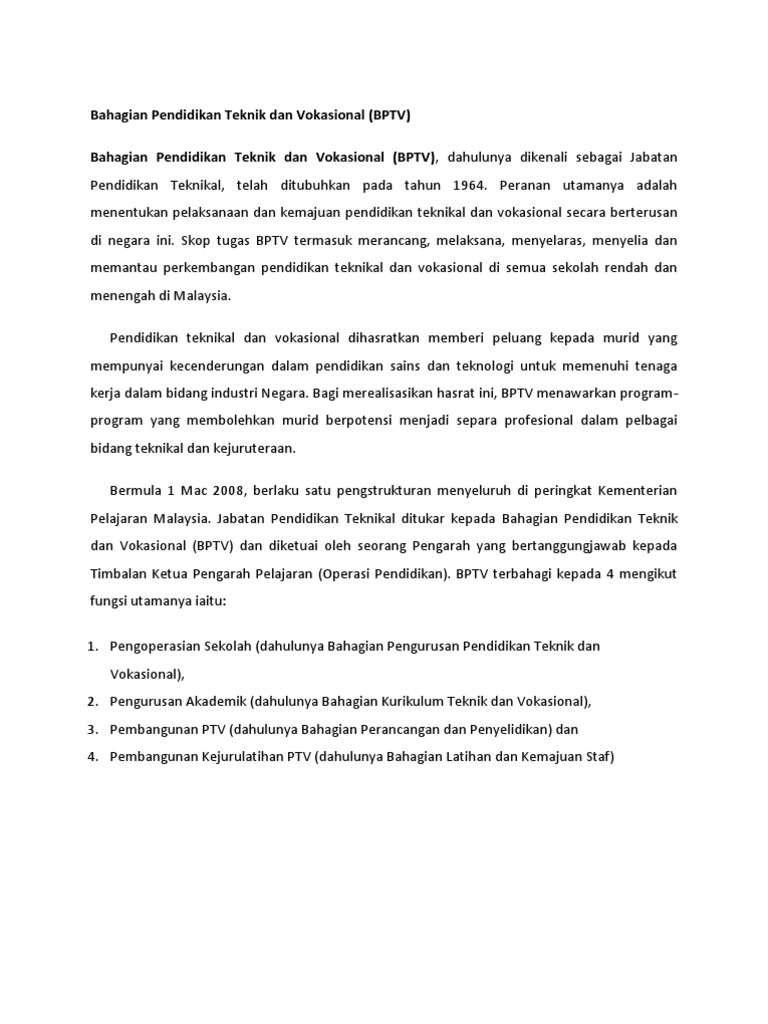 S istem pendidikan teknik dan vokasional ptv memainkan peranan penting dalam pembangunan sosial dan ekonomi seperti negara korea selatan dan jerman yang telah menjadikan negara mereka berpendapatan tinggi melalui sistem ptv. Bahagian pendidikan teknik dan vokasional bptv dahulunya dikenali sebagai jabatan pendidikan teknikal telah ditubuhkan pada tahun 1964. Bahagian pendidikan teknik vokasional. Hubungi 03 80008000 atau u p.