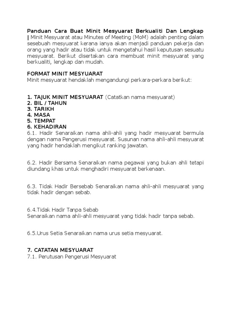 Minit mesyuarat atau minutes of meeting mom adalah penting dalam sesebuah mesyuarat kerana ianya akan menjadi panduan pekerja dan orang yang hadir atau tidak untuk mengetahui hasil keputusan sesuatu mesyuarat. Minit mesyuarat atau minutes of meeting mom adalah penting dalam sesebuah mesyuarat kerana ia akan menjadi panduan dan rujukan buat pekerja dan orang yang hadir atau tidak untuk mengetahui hasil keputusan sesuatu mesyuarat. Cara buat minit mesyuarat format minit mesyuarat. Mesyuarat bilangan ke berapa 3.