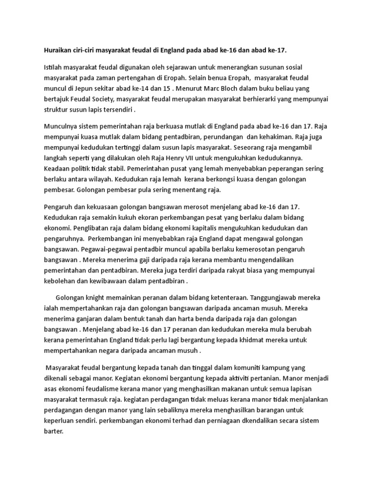 Tema 1 masyarakat feudal masyarakat feudal di england abad ke 16 dan 17 2. Huraikan ciri ciri masyarakat maritim di portugal pada abad ke 16 hingga 17. Raja adalah dilantik oleh tuhan untuk memerintah rakyatnya tugas rakyat adalah untuk membantu raja tanpa soal mendapat sokongan institusi gereja dan raja. Masyarakat feudal england penubuhan sistem monarki di england pada abad ke 16 telah membawa kepada sistem feudal selepas perang bunga ros the war of rose 1450 1485 35 tahun iaitu.