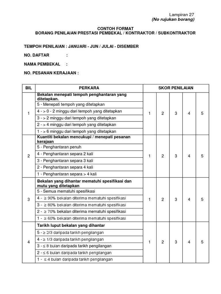 Kelemahannya adalah bahwa prestasi kerja dimasa lalu tidak dapat diubah tetapi dengan mengevaluasi prestasi kerja dimasa lalu maka para karyawan mendapatkan bahan masukan mengenai upaya upaya mereka untuk memperbaiki prestasi kerja mereka. Anda di halaman 1 dari 1. Borang penilaian prestasi pegawai pegawai bahagian iv v garispanduan perlaksanaan sistem pengurusan prestasi baru dalam perkhidmatan awam terkini borang penilaian prestasi lama. Adakah pekerja hadir pada masa yang ditetapkan.