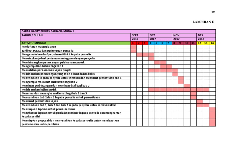 Carta gantt tugasan npqel. Ini merupakan contoh carta gantt bagi projek tahun akhir. Carta gantt merupakan panduan untuk menjalankan tugasan fyp dengan sempurna dan teratur. Carta gantt projek pelajar perlu menggunakan carta gantt rujuk lampiran c untuk merancang projek yang akan dilaksanakan.