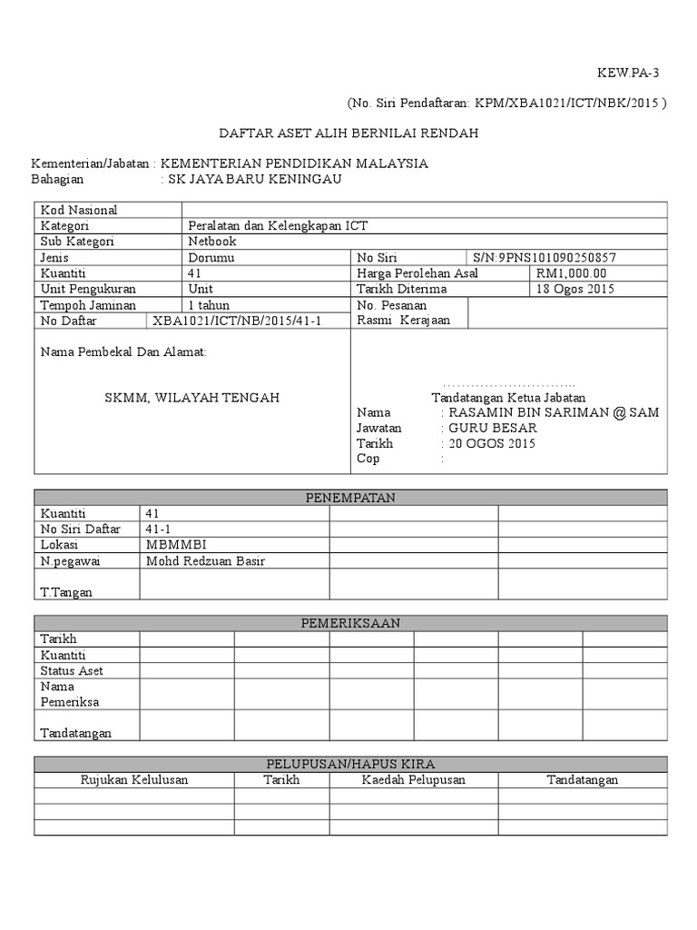 Scribd is the world s largest social reading and publishing site. Smk abc harta modal aset alih bernilai rendah jumlah keseluruhan aset alih tahun semasa nilai perolehan asal kuantiti kew pa 3 nilai semasa rm kuantiti kew pa 4 nilai perolehan asal kuantiti nilai perolehan asal rm rm baki awal m 660 n. Nombor siri pendaftaran keterangan aset cara aset diperolehi tarikh terima harga perolehan asal pelupusan rm nilai semasa rm status aset pindahan hapus kira jumlah jumlah keseluruhan nota. Kenyataan tawaran tender pelupusan aset alih kerajaan 1.