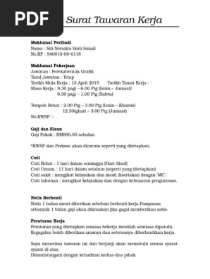 Download contoh surat terima tawaran kerja seperti yang telah dibincangkan saya akan memulakan kerja pada 01 disember 2017 permulaan gaji sebanyak rm1500 bulanan dan faedah perubatan serta insurans meliputi kontrak syarikat yang ditawarkan. Sekali lagi selamat datang dan kami berharap kehadiran anda akan memajukan lagi organisasi ini. Sepanjang tempoh perkhidmatan ini kedua dua pihak boleh menamatkan perkhidmatan melalui pemberian notis 3 bulan lebih awal. Kumpulan contoh surat tawaran kerja doc terlengkap 2019.