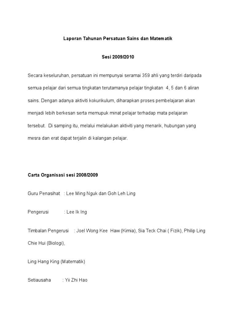 Contoh laporan aktiviti tahunan persatuan. Persatuan ini dibentuk untuk membantu meningkatkan pencapaian pelajar dalam mata pelajaran sains dan matematik serta memudahkan pelajar bertukar tukar pendapat tentang pelajaran ini. Contoh laporan tahunan persatuan penduduk format laporan tahunan persatuan contoh laporan tahunan kelab persatuan contoh laporan aktiviti tahunan persatuan contoh laporan tahunan organisasi contoh laporan tahunan promkes puskesmas contoh laporan tahunan hrd contoh laporan tahunan perusahaan contoh laporan tahunan jabatan contoh laporan tahunan perpustakaan sekolah contoh laporan. Unit kokurikulum ssbj lapotan tahunan kelab persatuan sukan permainan unit beruniform 2013 bil perkara catatan 1 pengenalan latar belakang kelab 2 visi misi kelab 3 objektif kelab 4 nama guru penasihat 5 jumlah ahli kelab 6 aktiviti yang dijalankan sepanjang tahun 7 aktiviti yang tidak dapat dijalankan sepanjang tahun. Format laporan aktiviti persatuan kelab pelajar borang laporan aktiviti persatuan kelab pelajar universiti kebangsaan malaysia 1 0.