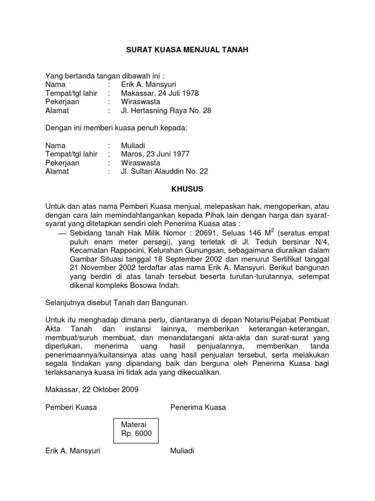 Contoh Surat Kuasa Jual Beli Tanah Pdf