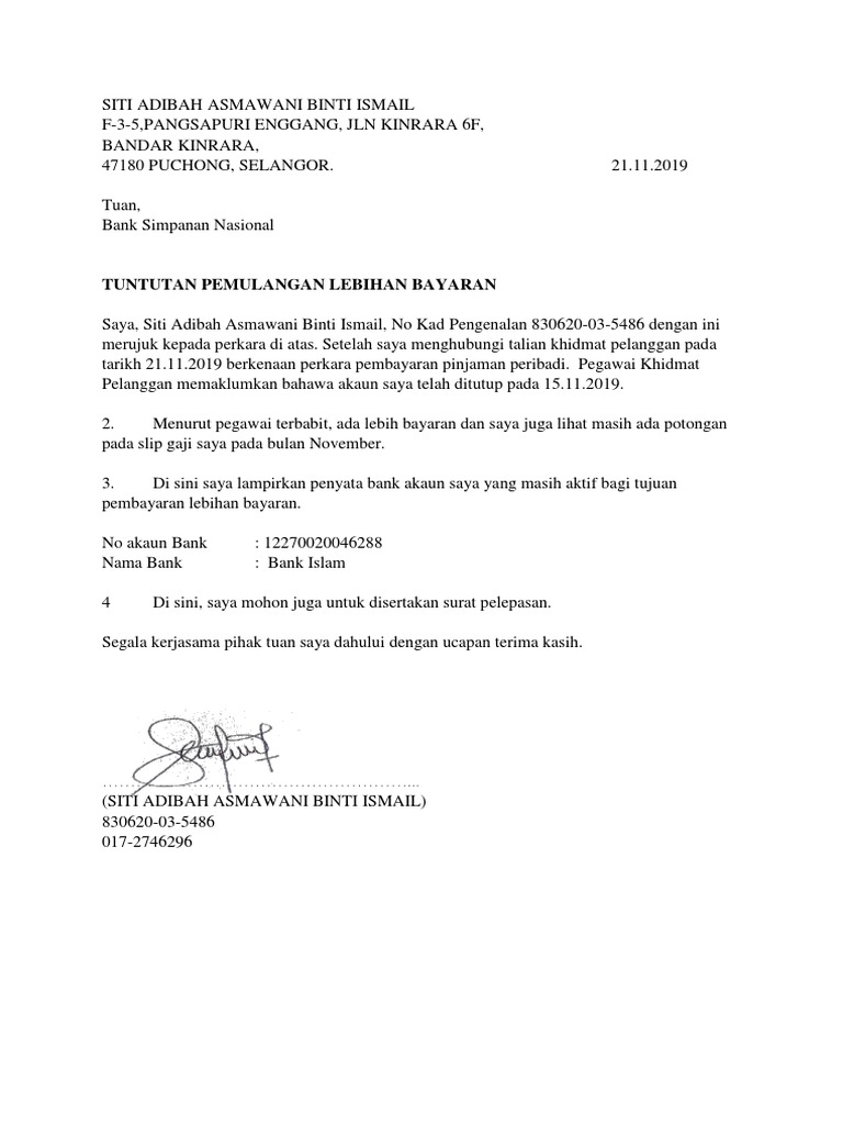 Kaedah tuntutan lebihan potongan pinjaman perumahan melalui bayaran gaji pencen lebihan baki kredit. Hantar surat rasmi beserta salinan pengesahan no akaun bank dari pihak bank. Contoh surat tuntutan bayaran klaim asuransi yang baik sebagai bahan referensi dalam pembuatan surat tuntutan dengan secara profesional. 1 surat permohonan bayaran balik oleh pemohon 2 borang permohonan tuntutan bayaran balik hasil 3 salinan kad pengenalan pemohon 4 salinan buku akaun pemohon pelajar 5 slip bayaran bimb yang asal beserta salinan sebagai bukti bayaran yang telah dibank in ke akaun politeknik kpt 6 surat tawaran.