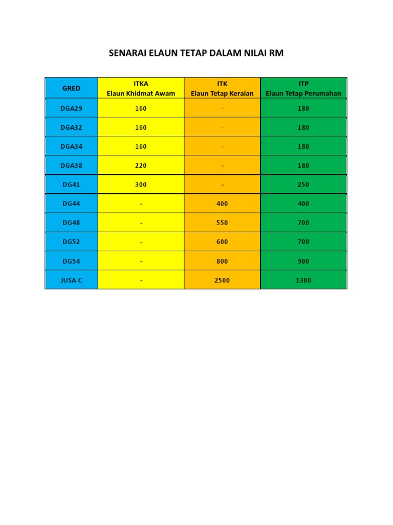 Kerajaan melaksanakan penetapan satu gred satu kadar imbuhan tetap khidmat awam itka bagi pegawai gred 41 dan 42 serta gred 45. Tempoh perkhidmatan yang diambilkira tidak termasuk tempoh cuti tanpa gaji. Gaji minimum gaji maksimum kadar kenaikan gaji tahunan rm 2 529 00 rm 9 643 00 rm 225 00 elaun.