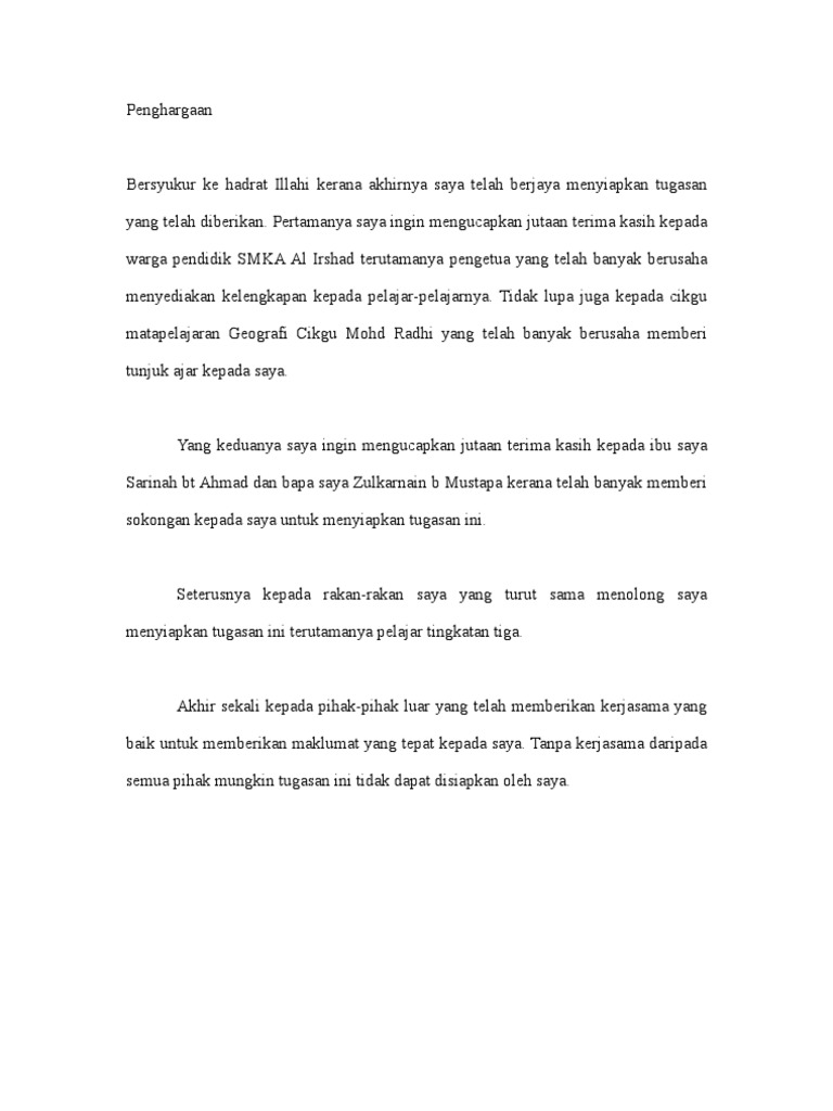 Alhamdulillah dan syukur dipanjat ke hadrat illahi kerana dengan izin dan limpah kurnianya dapat saya menyiapkan kerja kursus geografi bagi memenuhi kriteria saya sebagai seorang calon pmr bagi tahun 2012 dalam masa. Tajuk kecil muka surat penghargaan pendahuluan objekif kajiankawasan kajian kaedah kajian hasil kajian rumusan lampiran rujukan 4. Kepentingan sistem pengangkutan di kampung pulai sebatang 82100. Friday october 30 2009.
