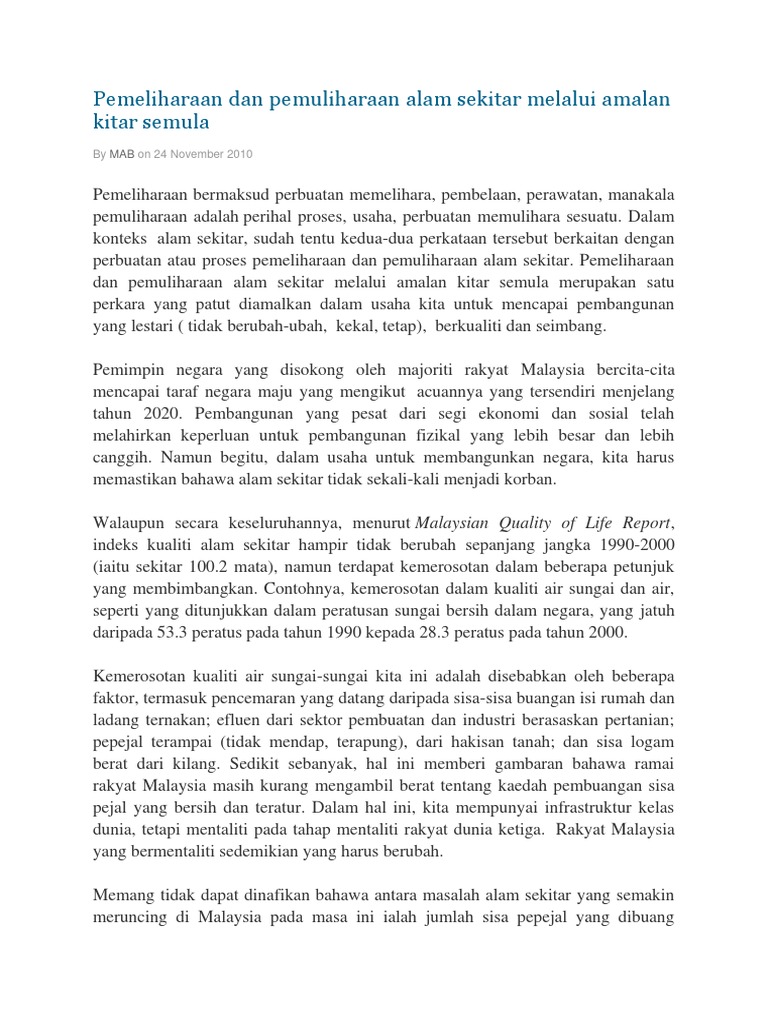 Karangan kepentingan pemeliharaan dan pemuliharaan alam sekitar. Alam sekitar merupakan tempat tinggal bagi flora dan fauna. Dalam konteks alam sekitar sudah tentu kedua dua perkataan tersebut berkaitan dengan proses pemeliharaan dan pemuliharaan alam sekitar. 06 09 2020 15 06 2019 by karangannet. Cara memelihara dan memulihara sumber alam.