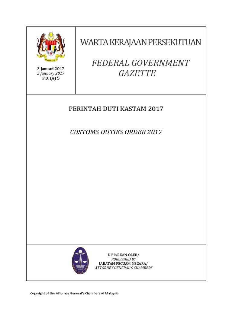 Harmonized commodity description coding system commonly known as hs codes and asean harmonized tariff nomenclature ahtn were created for international use by the custom department to classify commodities when they are being declared at the custom frontiers by exporters and importers. Declaration of hs code in cost analysis and certificate of origin coo starting 1st april 2017 perintah duti kastam pdk 2017 has been implemented to replace the pdk 2012. 2 digit pertama dari hs code disebut sebagai bab. Jabatan kastam diraja malaysia kompleks kementerian kewangan no 3 persiaran perdana presint 2 62596 putrajaya 1300 888 500 pusat panggilan kastam 1800 888 855 aduan penyeludupan 03 8882 2100 2300 ibu pejabat ccc customs gov my.