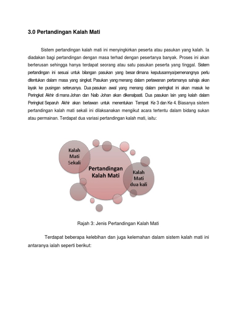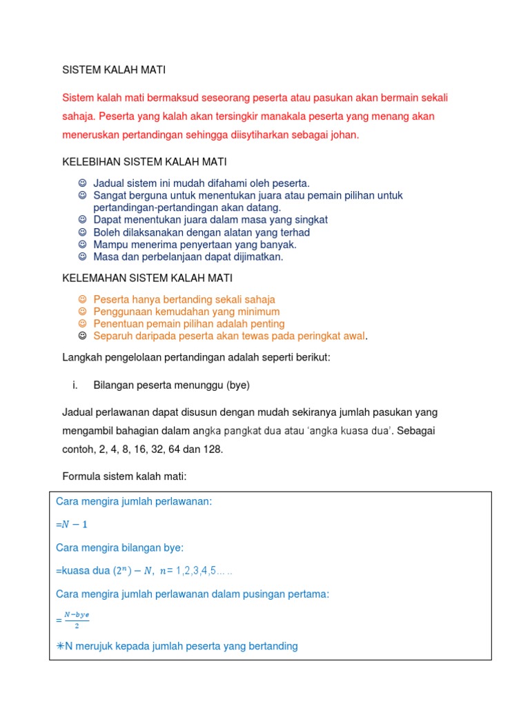 Proses penyingkiran berterusan sehingga tinggal seorang pemenang. Sistem ini bukan cara yang terbaik untuk mengukur keupayaan sesuatu pasukan atau peserta. Apakah kelemahan utama sistem kalah mati 2 kali. Apakah ciri utama sistem kalah mati sekali.