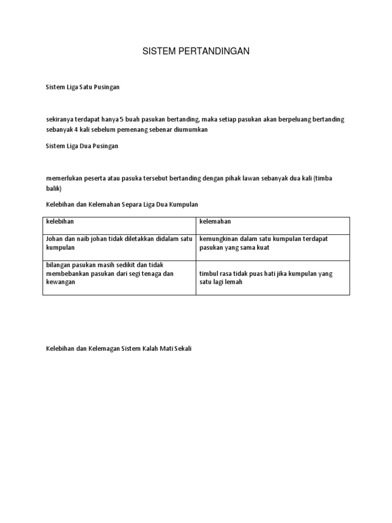 Langkah langkah untuk menentukan jumlah pasangan perlawanan dalam sistem pertandingan liga. Menghasilkan pemenang yang mutlak. 8 8 sistem kalah mati dua kali pertandingan cara ini memberi peluang kepada setiap peserta bermain sekurang kurangnya dua kali sebelum tersingkir terus dari pertandingan peserta yang menang di peringkat awal akan memaju ke kanan untuk menjadi johan manakala peserta yang kalah ditempatkan ke kiri peserta yang kalah sekali masih berpeluang untuk menjadi juara dan hanya disingkir selepas kalah ke. Kalah mati sekali dua kali cabar mencabar tangga piramid corong.