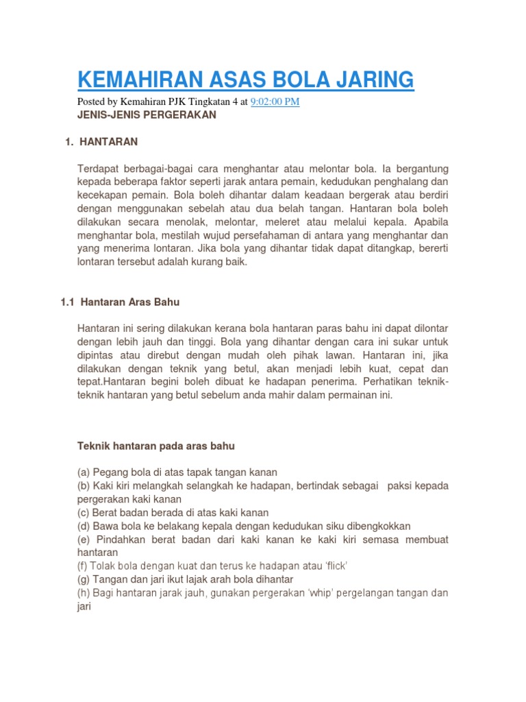 Pemain terpaksa menggerakkan bola dengan membuat hantaran pada masa yang tepat dengan cara yang sesuai dengan situasi permainan kerana dalam permainan bola jaring tidak ada pilihan untuk menggelecek bola. Kemahiran dalam bola jaring pada asasnya permainan bola jaring memerlukan kemahiran melakukan hantaran dan menerima bola. Kemahiran kemahiran asas bola jaring. Hantaran gerakan kaki kawalan lompatan jaringan lontaran halaman utama kuiz.