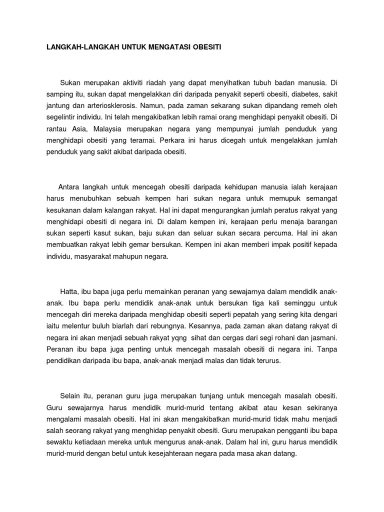 Punca dan cara mengatasi masalah obesiti 10 27 pg esei. Sekiranya pesakit mendapati dirinya amat sukar untuk mengurangkan berat badan dengan senaman dan diet sihat atau paras obesiti paras adalah kritikal dan boleh mengancam nyawanya pesakit itu perlu mengambil ubat ubatan khas. Memandangkan kesan akibat obesiti adalah bahaya mereka yang terlibat perlu mengambil langkah langkah yang sewajarnya untuk menjaga kesihatan tubuh badan mereka kerana kesihatan diri adalah tanggungjawab diri masing masing. Bukan itu sahaja mereka yang mengalami masalah ini mudah diserang penyakit.