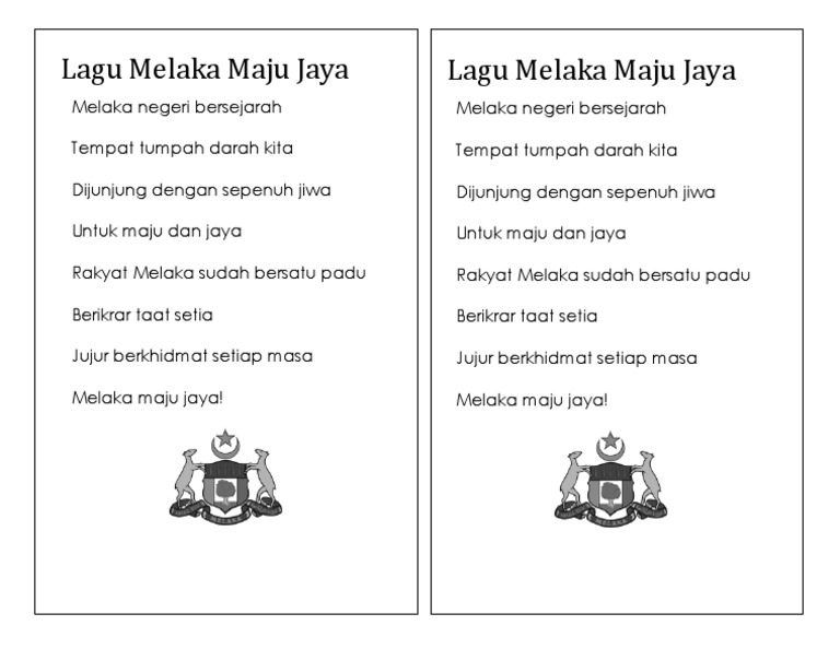 Lirik lagu melaka maju jaya lagu negeri melaka negeri bersejarah tempat tumpah darah kita dijunjung dengan sepenuh jiwa untuk maju dan jaya rakyat melaka sudah bersatu padu berikrar taat setia jujur berkhidmat setiap masa melaka maju jaya.