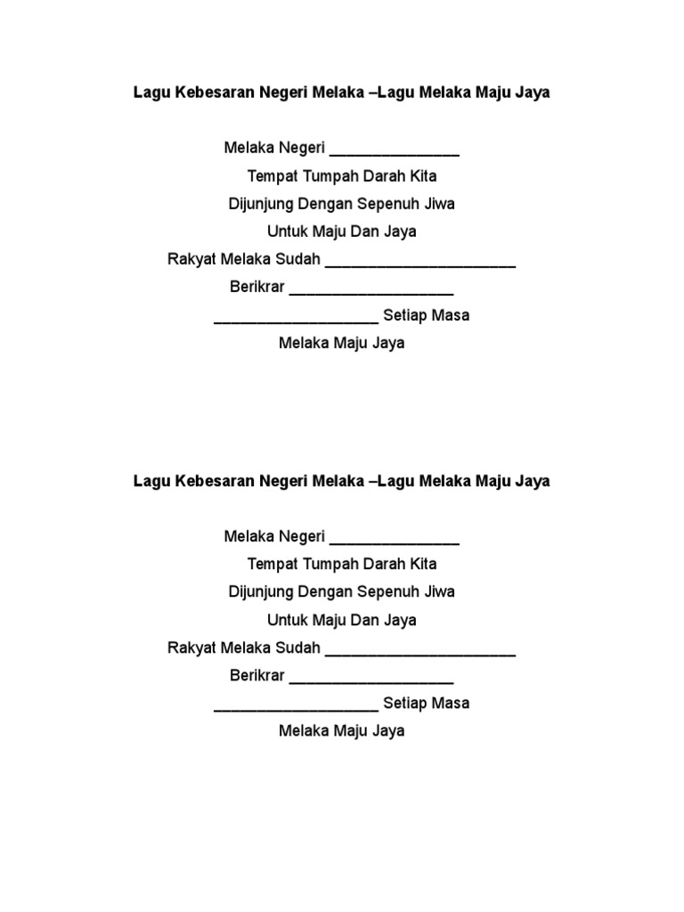 Rakyat melaka sudah bersatu padu berikrar taat setia jujur berkhidmat setiap masa melaka maju jaya melaka maju negeriku sayang melaka maju negeriku sayang gagah berani negeri indah tak terperi nilai murni kualiti tinggi. Pengangguran merebak luas kemiskinan merajalela pedagang kaki lima tergusur teraniaya bocah bocah kecil merintih melangsungkan mimpi di jalanan buruh kerap dihadapi penderitaan. Melaka bandar bersejarah tempat tumpah darah kita dijunjung dengan sepenuh jiwa untuk maju dan jaya rakyat melaka sudah bersatu padu berikrar taat setia jujur berkhidmat setiap masa melaka maju jaya. Lirik lagu negeri melaka lagu negeri.