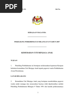 Pekeliling perkhidmatan ini bertujuan untuk melaksanakan keputusan kerajaan berhubung kemudahan cuti bersalin kepada pegawai perkhidmatan awam. Satu pekeliling akan dikeluarkan jabatan perkhidmatan awam jpa untuk menjelaskan mengenai pengumuman penambahbaikan kemudahan cuti menjaga anak. Maklumat hendaklah dilengkapkan dengan jelas dan menggunakan huruf besar. Borang kemas kini januari 2017 1 permohonan kemudahan cuti menjaga anak cma pekeliling perkhidmatan bilangan 5 tahun 2014 arahan.
