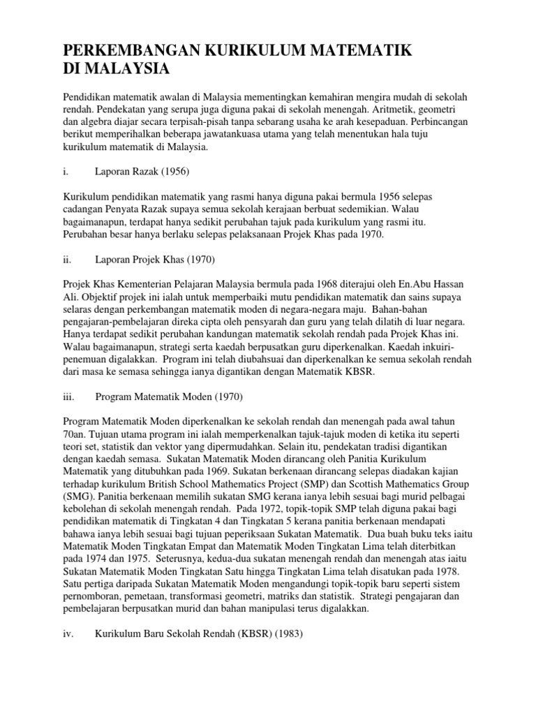 Perkembangan kurikulum di malaysia. Bahagian pembangunan kurikulum bpk merupakan satu bahagian di bawah sektor dasar dan pembangunan pendidikan kementerian pendidikan malaysia. Perkembangan kurikulum matematik di malaysia pendidikan matematik awalan di malaysia mementingkan kemahiran mengira mudah di sekolah rendah. Bagi tujuan pembentangan penulis akan mengupas tajuk kepada 2 bahagian utama. Kurikulum perlu diubahsuai mengikut keperluan supaya pelajar sentiasa belajar mengikut trend pengetahuan terkini.