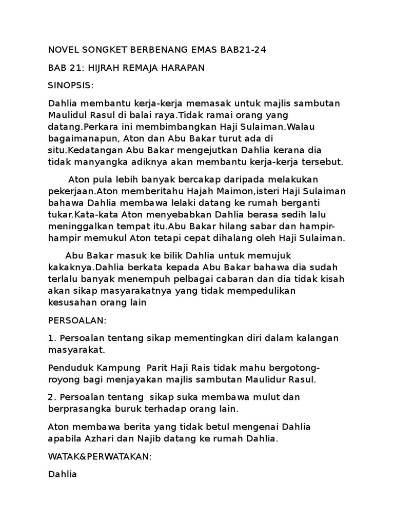 Sinopsis bab demi bab sinopsis keseluruhan tema persoalan watak dan perwatakan latar masa latar tempat latar masyarakat binaan plot gaya bahasa nilai pengajaran novel songket berbenang emas k6. Persoalan tentang kasih sayang antara ahli keluarga dahlia sangat menyayangi emaknya saleha. Novel songket berbenang emas.