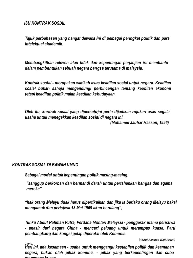 Rujukan kepada kontrak sosial. Dalam konteks ini mana mana pindaan ke atas kontrak sosial akan menyebabkan terbatalnya keseluruhan perjanjian kontrak sosial yang ditandatangani sewaktu kemerdekaan. Perlu diingatkan sewaktu tunku abdul rahman berusaha mendapatkan kemerdekaan beliau perlu mendapatkan persetujuan raja raja melayu untuk menyerahkan hak eksekutif negeri kepada kerajaan pusat. Kontrak sosial merujuk kepada perjanjian oleh bapa bapa perjuangan kemerdekaan dalam perlembagaan merupakan penggantian beri memberi atau quid pro quo melalui perkara 14 18 berkenaan pemberian kewarganegaraan tanah melayu kepada kaum imigran bukan melayu dan perkara 153 memberikan hak istimewa kepada rakyat melayu bumiputra. Kontrak sosial dalam konteks politik malaysia difahamkan sebagai pendalaman mengenai perlembagaan negara tersebut di mana dikatakan adanya satu persetujuan di kalangan pemimpin atau kumpulan elit tertentu dan merupakan secara beri gnti atau quid pro quo melalui perkara 14 1100000 yang berkenaan dengan pemberian kewarganegaraan malaysia kepada orang orang bukan melayu dan perkara 153 yang.