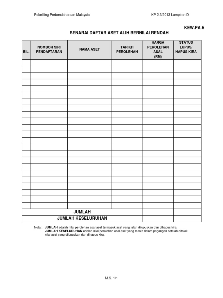 Daftar harta modal 15 kew pa 2 penjelasan daftar harta modal 16 daftar inventori 18 kew pa 3 penjelasan daftar inventori 29 kew pa 4 senarai daftar harta modal 20. Pesanan rasmi kerajaan dan tarikhtempoh jaminan nama pembekal dan. Aset alih dipermodalkan aset alih bernilai rendah aset alih tidak dipermodalkan aset alih yang harga perolehan asalnya rm2 000 atau lebih setiap satu unit aset alih yang harga perolehan asalnya kurang rm2 000 setiap unit nota. Senarai daftar aset alih bernilai rendah kew pa 6 lampiran d hendaklah disediakan mengikut tahun semasa oleh bahagian cawangan ptj masing masing.