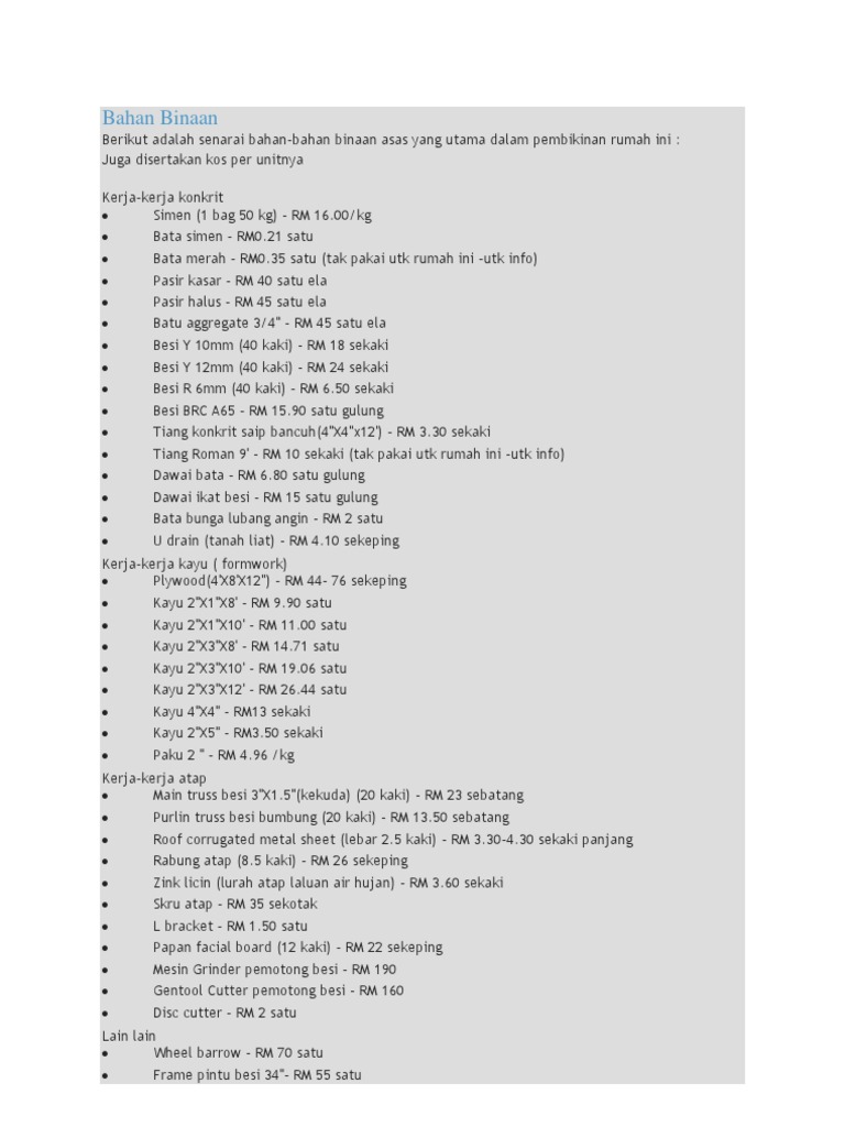 Bina rumah sendiri harga bahan binaan rumah batu tiang pasir kayu besi dan upah tukang buat rumah simen 1 bag 50 kg rm 16 00 kg bata simen rm0 21 satu. Berita peristiwa. Senarai harga kerja kerja renovation hiasan dalaman pertukangan plumbing dan pemasangan elektrik dan penjagaan rumah 2020. Brc a6 6 x 10 rm60 sheet 7.