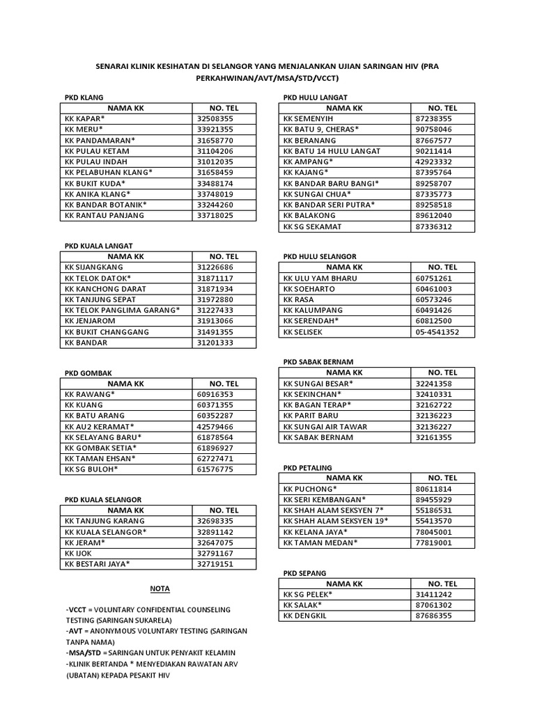 Menjalankan prosedur patch test tiga kali se minggu. Senarai klinik kesihatan kerajaan selangor ujian hiv isnin khamis 2 00 4 00 petang jumaat 2 30 4 00 petang daerah klang no. Tel daerah hulu langat. Borang mana kena bagi dekat pejabat agama.