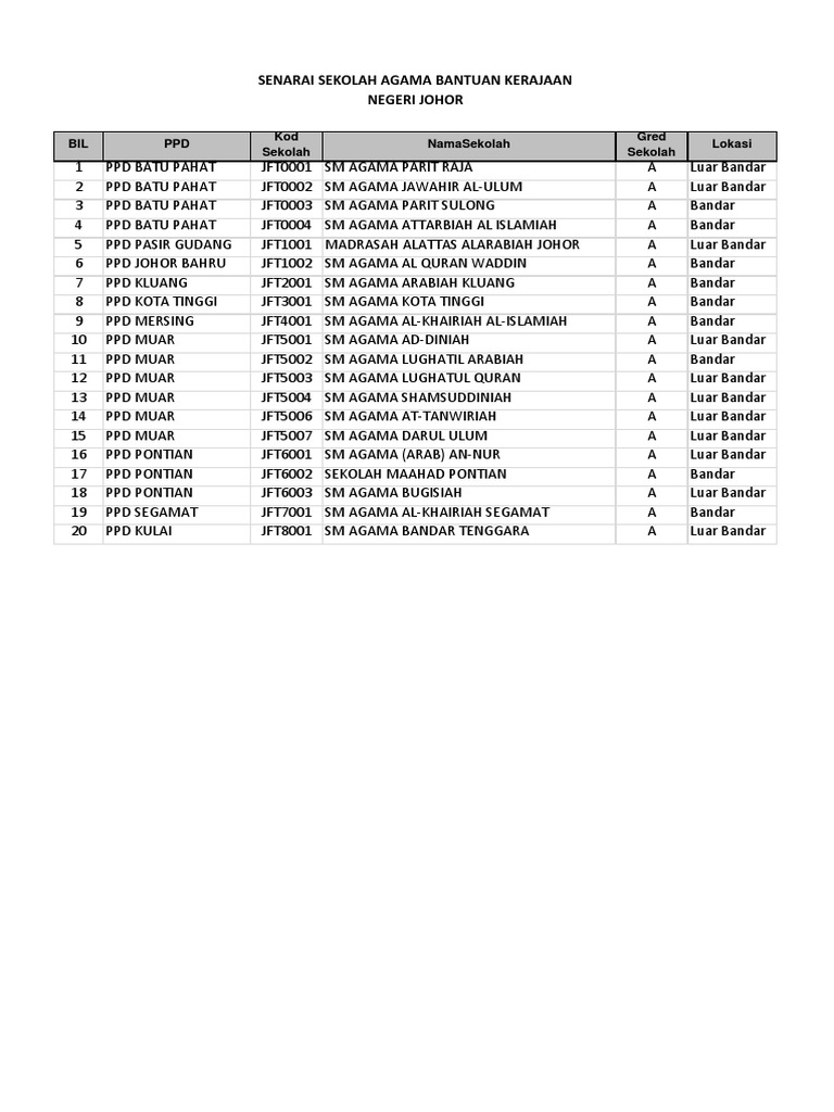 Maahad tahfiz johor johor bahru terbuka untuk lelaki sahaja. Sekolah menengah agama kerajaan johor kluang johor. Related posts to senarai sekolah rendah agama bantuan kerajaan senarai sekolah rendah agama bantuan kerajaan 2019 11 12t10 32 00 08 00 rating. Sekolah menengah agama parit raja batu pahat 86400 parit raja batu pahat johor no.