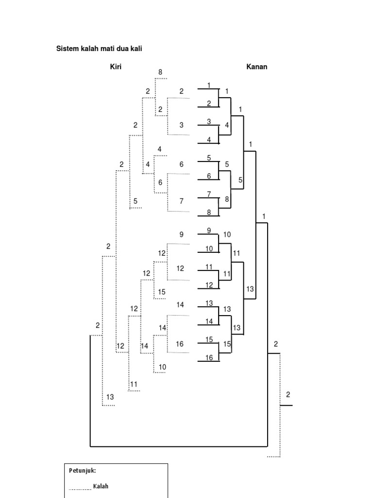 8 8 sistem kalah mati dua kali pertandingan cara ini memberi peluang kepada setiap peserta bermain sekurang kurangnya dua kali sebelum tersingkir terus dari pertandingan peserta yang menang di peringkat awal akan memaju ke kanan untuk menjadi johan manakala peserta yang kalah ditempatkan ke kiri peserta yang kalah sekali masih berpeluang untuk menjadi juara dan hanya disingkir selepas kalah ke. Pertandingan kalah mati dua kali. Seterusnya pertandingan diadakan sehingga keputusan bagi menentukan johan diperoleh. Sistem ini seperti sistem kalah mati sagu hati.