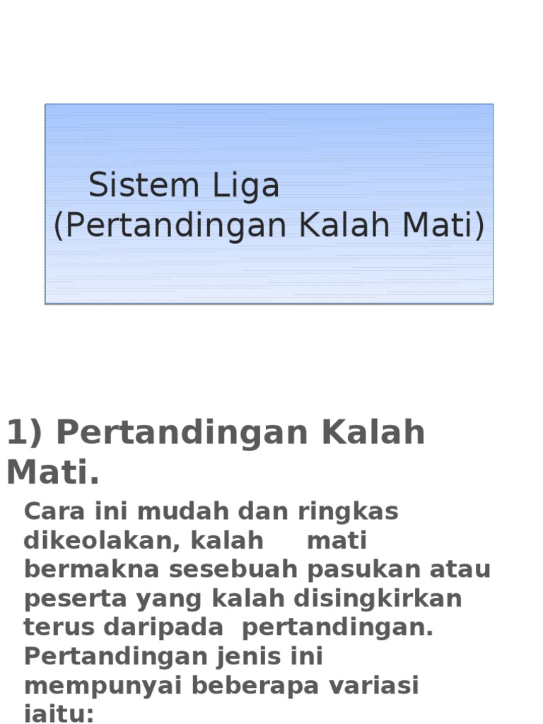 6 6 found this document not useful mark this document as not useful. Pasukan yang menang layak ke pusingan seterusnya manakala pasukan yang kalah akan disingkirkan. Setiap peserta akan diundi untuk menentukan lawan masing masing. Sistem kalah mati boleh diaplikasikan dalam hampir semua permainan terutamanya pertandingan skuasy ping pong badminton dan tenis.