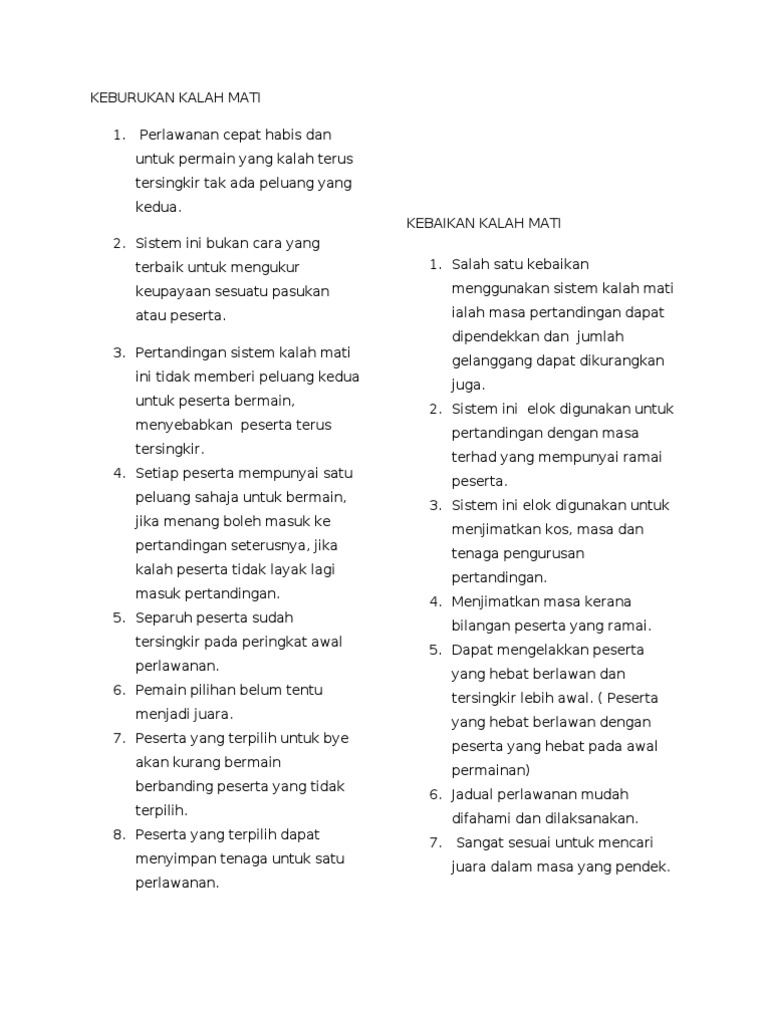 Apakah ciri ciri yang membolehkan sistem kalah mati sekali di jalankan untuk sesuatu pertandingan. 94 94 found this document useful mark this document as useful. Juga kerana terlalu ramai penyertaan. Pertandingan kalah mati sistem pertandingan ini menyingkirkan peserta atau pasukan yang kalah.