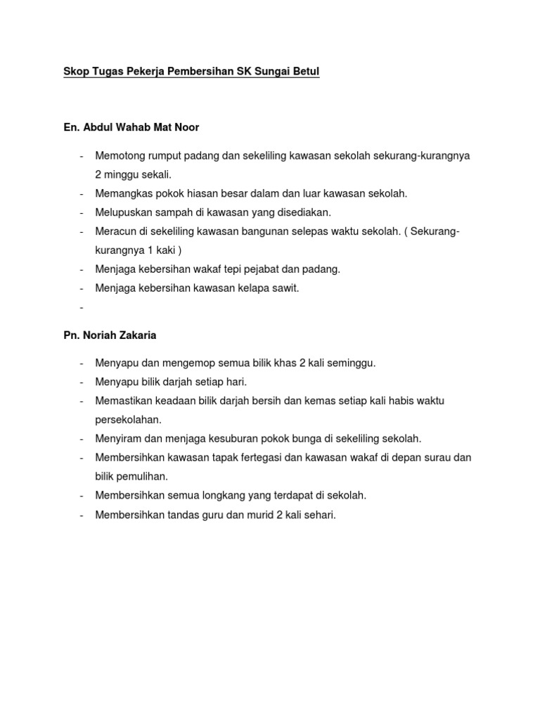 Skop kerja perkhidmatan pembersihan awam skop terdapat enam 6 skop perkhidmatan pengurusan pembersihan awam di kawasan pentadbiran majlis perbandaran kajang mpkj seperti senarai berikut. Sk tidung tabin kinabatangan 1 masa bertugas bagi pekerja pembersihan adalah dari jam 8. Lh berhad melantik amirul enterprise untuk membuat kerja kerja pembersihan tanah untuk pembinaan sebuah hotel di labuan dengan nilai kontrak rm600 000. Syarikat terbabit biasanya boleh mengatur pekerja mengikut keperluan kontrak kerja yang tidak hanya bergantung kepada kontrak kebersihan sekolah bagi menempatkan.