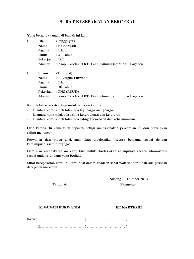 Suami istri contoh surat perjanjian kesepakatan bersama. Academia edu is a platform for academics to share research papers. Namun jika perceraian merupakan satu satunya jalan untuk menyelesaikan masalah rumah tangga apalagi demi kebaikan bersama maka perceraian ini sah sah saja untuk dilakukan. Perceraian adalah hal yang sangat tidak diinginkan oleh pasangan suami istri manapun. Untuk keperluan tersebut di atas suami saya berhak menghadap pejabat pt.