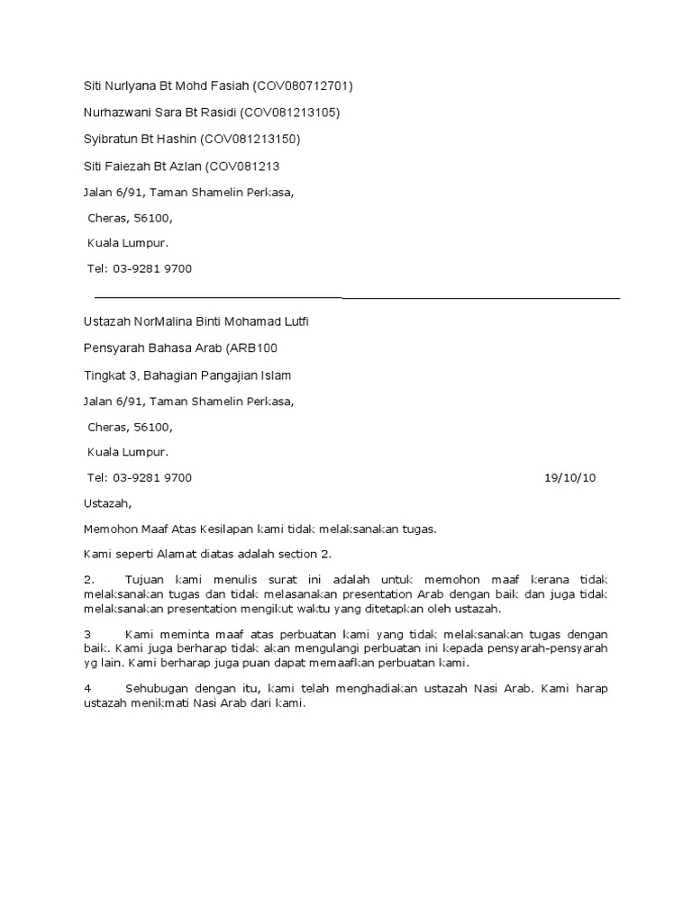 Contoh surat kiriman rasmi memohon maaf. Muhammad nazrool razziq b nordin. Bukan hanya dalam urusan personal saja namun permintaan maaf juga sangat dibutuhkan dalam urusan formal. Contoh surat permohonan dalam kehidupan sehari hari sering kali kita dihadapkan dengan suatu situasi yang tidak dapat dikerjakan dengan sendiri dan harus memerlukan bantuan pertolongan dari orang lain agar permohonan tersebut dikabulkan maka kita harus membuat sebuah surat permohonan yang ditujukan kepada pihak yang bersangkutan.