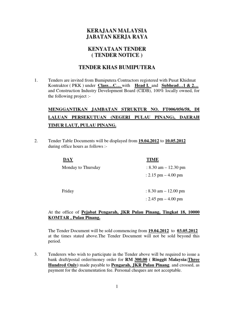 Tender kementerian kerja raya. Rm500 00 bayaran atas nama. Notis sebut harga tender. 03 8000 8000 faks. Lampiran b1 borang q14a 2005 a kertas perakuan tender kepada lembaga perolehan a jabatan kerja raya bil.