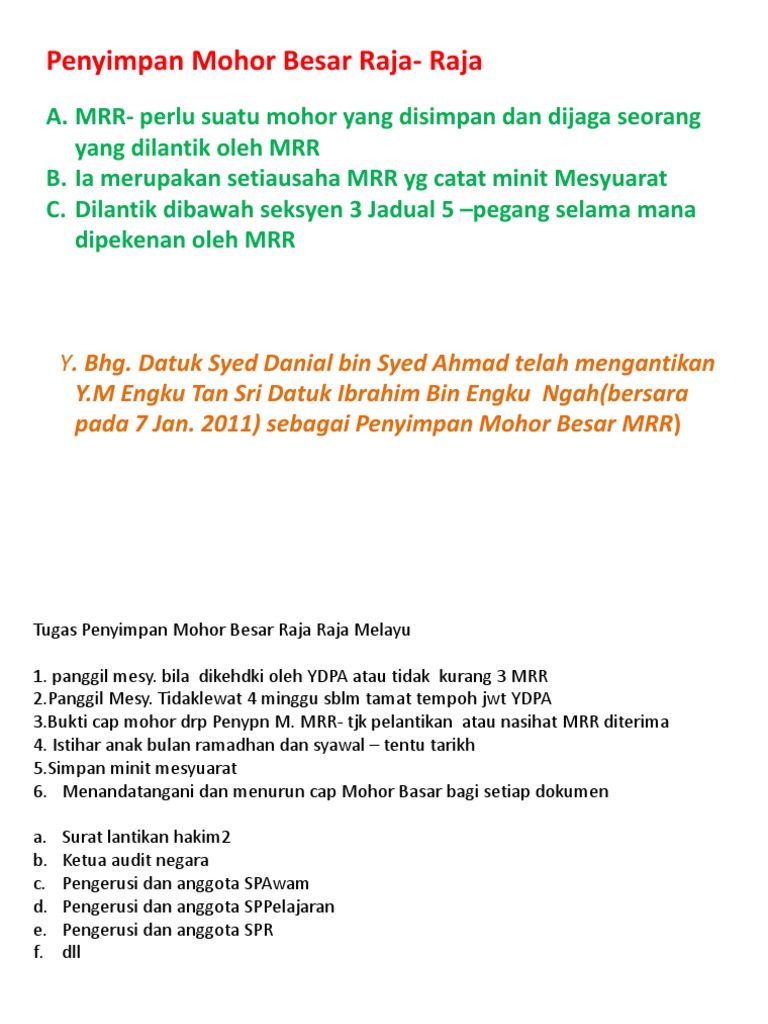 Penyimpan mohor besar raja rajapenyimpan mohor besar raja raja dilantik oleh mrr untuk menjalankandilantik oleh mrr untuk menjalankan tugas menyimpan mohor besar raja rajatugas menyimpan mohor besar raja raja munni 2006munni 2006 yang berbahagia dato seri syed danial bin syed ahmad 13. Tugas tugas penyimpan mohor besar raja raja adalah seperti yang berikut a menerima dan mengedarkan kertas kertas kerja yang hendak dikemukakan dalam mesyuarat majlis raja raja. Penyimpan mohor besar raja raja mohor besar raja raja rulers seal fungsi mohor besar raja raja penggunaan mohor besar raja raja carta organisasi mantan penyimpan mohor besar raja raja ketua pegawai maklumat cio peranan majlis raja raja pengenalan kedudukan majlis raja raja dalam pemerintahan negara malaysia fungsi. Mohor besar yang pertama berukuran 51 cm panjang 22 cm lebar 52 cm tinggi dan seberat 93 kg.