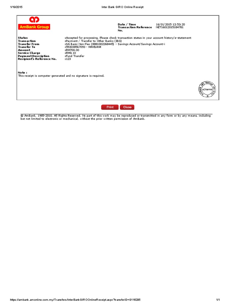 It provides multi currency real time gross settlement of interbank fund transfers multi currency debt securities settlement and depository services. With bsn interbank giro you can do all your banking in one place. However the instant interbank fund transfer ibft service charge is reduced to only rm 0 53 service fee rm0 50 gst rm0 03 from jun 2015. Balance of un utilised overdraft approved by ambank.
